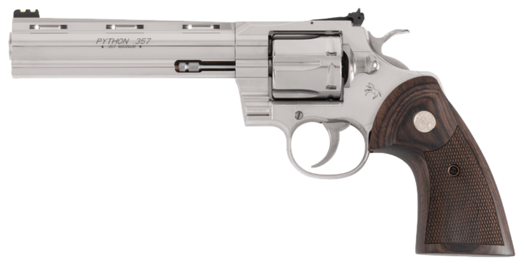 Wir stellen den Target Python vor. Ausgestattet mit Walnussgriffen mit einem silbernen Colt Medaillon und einem Edelstahlrahmen mit polierten Finish. Der einteilige Edelstahllauf mit ventilierter Schiene gewährleistet Präzision, während die neu gestaltete Kimme Stärke und Einstellbarkeit bietet. Mit einem vom Benutzer austauschbaren grünen Fiberoptik-Korn und einer gefluteter 6-Schuss-Trommel, die für .357 Magnum wie auch 38 Special-Patronen geeignet ist, bietet der Target Python Vielseitigkeit und Leistung in einem schlanken Paket