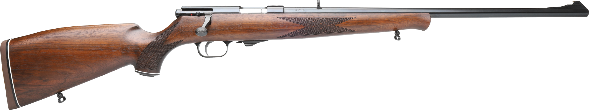 Die ideale Waffe für die Jagd auf Raubwild, Raubzeug und auf Rehwild. Führig, leicht, gut ausbalanciert, mit sehr guter Schussleistung. Schwerer, konischer Lauf. Prismaschiene mit Zielfernrohrmontage-Löchern, bewährter Zylinderverschluss mit doppelter Verriegelung, stecherartig, weicher, verstellbarer Druckpunktabzug oder Direktabzug mit seitlicher, lautloser Schiebesicherung. Führiger Nussbaumschaft mit ausgeprägter Backe, fein geschnittener Fischhaut an Vorderschaft und Pistolengriff, Gummischaftkappe, mit 2 montierten Riemenbügeln. (Auslieferung erfolgt ohne Zielfernrohr)