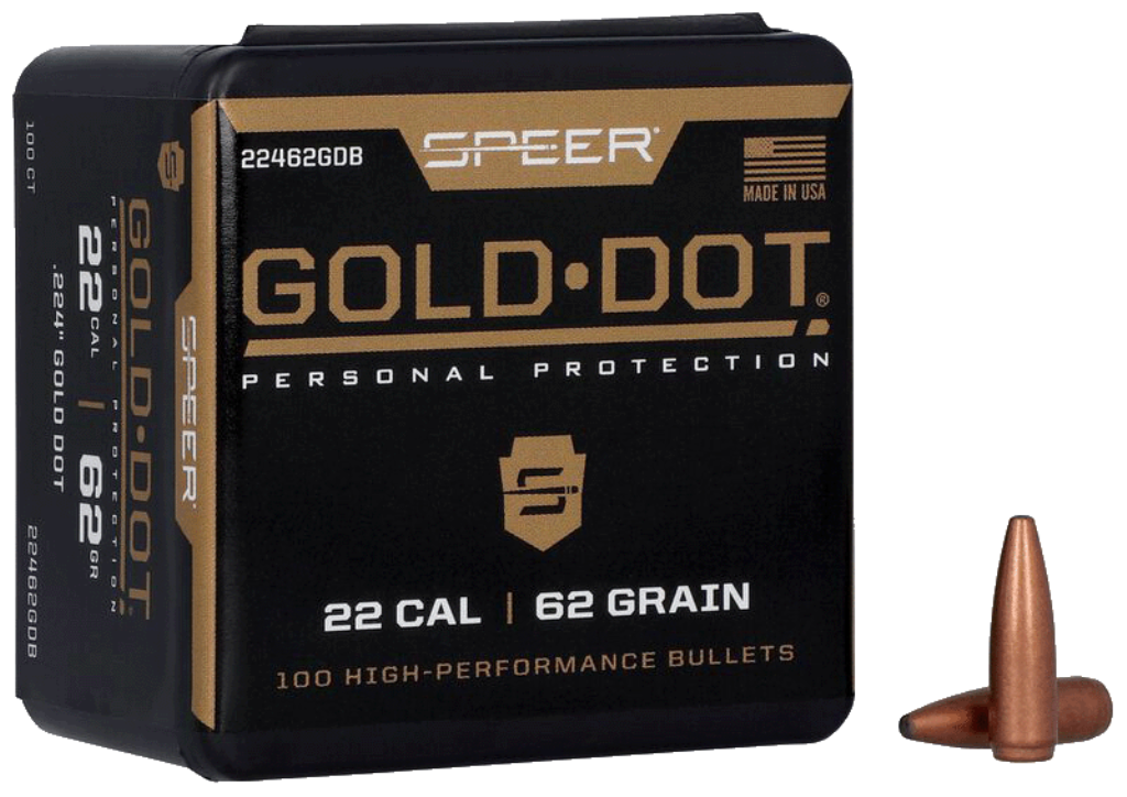 Law enforcement professionals trust the Gold Dot® bullet design with their lives every day. Now Speer® offers consumers the same performance in a line of personal protection rifle bullets. Their exclusive manufacturing process bonds the uniform jacket to the core one atom at a time, ensuring proper expansion and nearly 100 percent weight retention. The result is superb accuracy and immediate, threat-stopping performance.