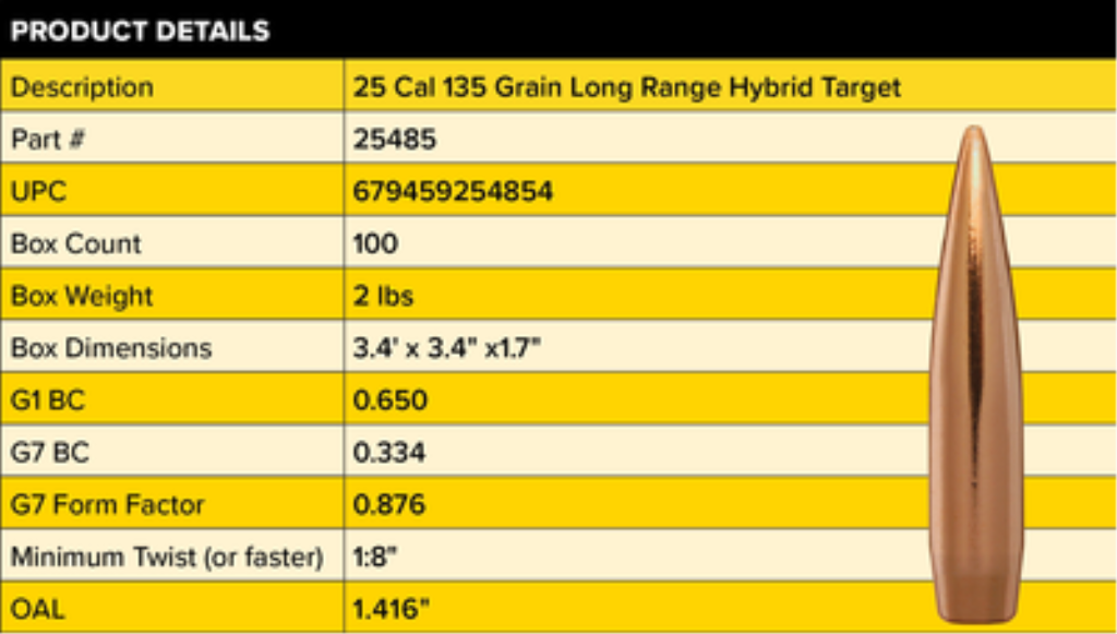 La balle LRHT de calibre 25 et 135 grains présente un coefficient balistique élevé et un profil ogival hybride tolérant aux sauts, vérifié par radar Doppler avec une variation du coefficient balistique inférieure à 1 %. Un coefficient balistique élevé est souhaitable pour le tir de compétition, mais la constance du coefficient balistique d'un tir à l'autre est essentielle lorsqu'il s'agit d'atteindre des cibles à 600 mètres et au-delà. Les 135 sont adaptées à des cartouches telles que les 25 Creedmoor, 25-06 Remington, 25×47 et 25 Precision Rifle Cartridge (PRC), entre autres.