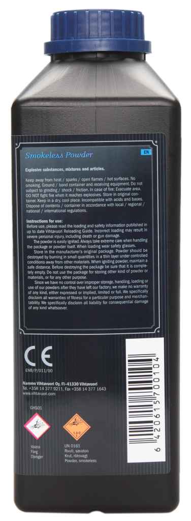 Vihtavuori N170 est la poudre de fusil à combustion la plus lente de la série N100 (sans tenir compte de 20N29 et 24N41) et en fait l'une des poudres de qualité cartouche les plus lentes disponibles sur le marché. Comme toutes nos poudres de carabine, les grains N170 sont de type cylindrique, simple perforé extrudé. Avec une longueur de 1,7mm et un diamètre de 1,1mm, la taille des grains est relativement grande.
